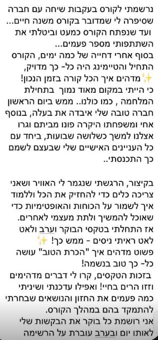 משיעור 10 תצאו באמונה שעליתם על דרך המלך ושיש את כל הכלים להצליח. תהפכו להיות השראה לכל מי שמסביבכם שלא יבין איך בחודשיים השתנתם כל כך הרבה.